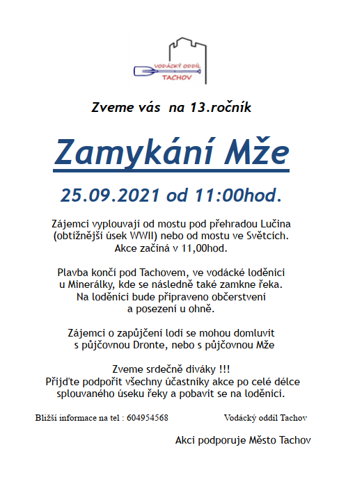 Ti odvážnější vodáci vyplouvají zhruba v 11:00 od mostu pod přehradou Lučina, kde je čeká obtížnější úsek Mže – WW II. Kdo se necítí, nechť dorazí ve 12:00 k mostu ve Světcích, kde proběhne i samotný salvnostní akt zamčení řeky.
