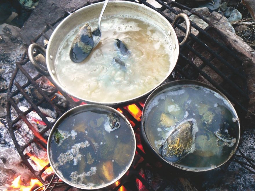 K večeři si uvaříme škeble, které tu pěstují na mnoha plantážích a které samozřejmě neušly naší pozornosti a přes den jsme si je nasbírali. Takhle přírodně vařené v hrnci a s máslem a na česneku je to opravdu pochoutka. K tomu dokonce máme i rybu hoki, Alešovi se zase poštěstilo něco chytit. Tu si ugrilujeme vedle na grilu a honosná hostina je na světě.