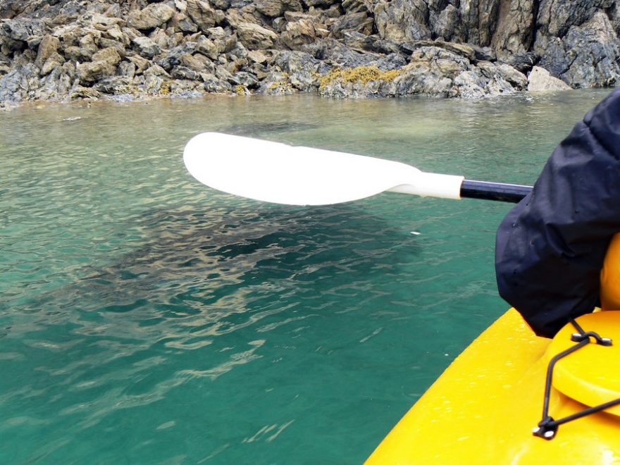 Ale vůbec nejsilnější zážitek tohohle výletu se přihodí až poslední den, taková příslovečná třešnička na dortu. Dnes už není kam spěchat, do Elaine Bay to nemáme daleko a do večera je času dost. Zase je nádherně, slunce hřeje a my se zdržíme za ostatními. Vychutnáváme si poslední chvilky na kajaku a pomalu driftujeme podél pobřeží. Zničehonic přestanu koukat kolem sebe a podívám se pod nás. A tam vidím obrovskou černou placku, tak neuvěřitelně blízko, na dosah ruky.