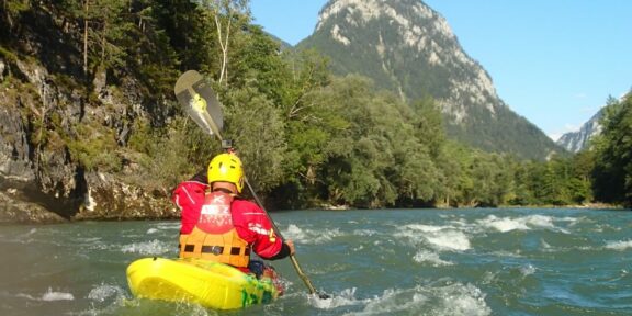 V sobotu nás čeká plavba na horním úseku řeky Enns. Nasedáme v Mandlingu vpravo za mostem. Řeka je tu poměrně úzká s velkým spádem a trochu nepřehledná, ale asi po 400 metrech zleva přitéká Mandlingbach, řečiště se za soutokem rozšíří na 15 až 20 metrů a tok se postupně zmírní. Stále ale plujeme šplouchavými peřejemi s občasným velkým balvanem, za kterým je vždy pěkný vracák.