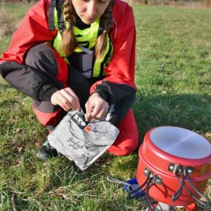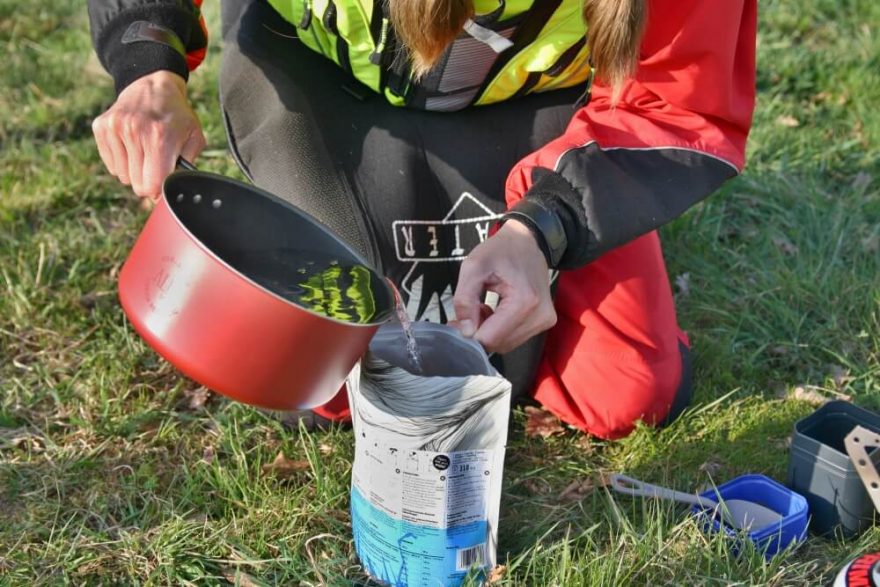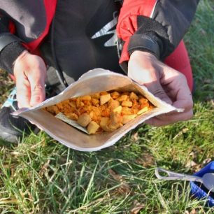 Než budeme v přípravě jídla pokračovat, přidám pár zkušeností. 1. chvíli mi trvalo, než jsem zjistil, že ryska pro nalití vody je na vnější straně sáčku. Měl jsem tendenci hledat ji uvnitř, kde nic takového není. 2. po nalití horké vody začaly některé sáčky na chvíli lehce zapáchat po plastu, ale na chuť ani vůni jídla to nemělo žádný dopad. Zápach nebyl cítit už ani po znovuotevření, když má být jídlo hotové. 3. výrobce v návodu udává dost přesné množství vody, kterou byte do sáčku měli nalít (273 ml a podobně). Asi těžko s sebou do přírody berete odměrku, tedy jsem tento údaj bral jen jako orientační a stejně jsem se řídil modrou ryskou, kde se trefíte docela přesně. Při delším používání se stejně ukázalo, že když se o něco málo seknete, zas tolik se nestane. Kdo by hladový řešil, že má ve špagetách trochu řidší omáčku, že?