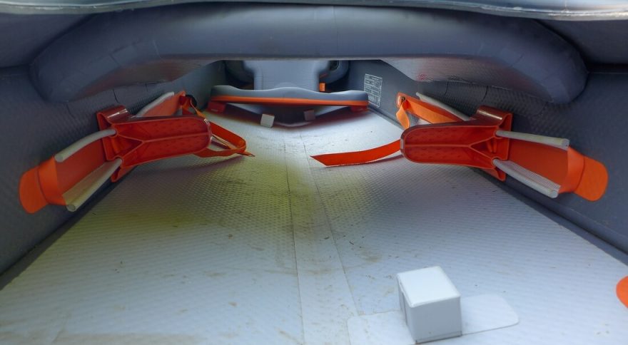 Po nafouknutí všech komor se do kajaku umístí nožní opěrky z tvrdého plastu, které se nasouvají na jakési kolejničky (viz foto) a plochými popruhy se uchytí do plastových žebříčkových spon vedle nohou jezdce. Posun opěrek je možný i za jízdy, a to včetně dotažení spon. Je to velice funkční a pohodlné řešení. Chválil jsem to už u jednomístné verze, ale tady musím znovu.