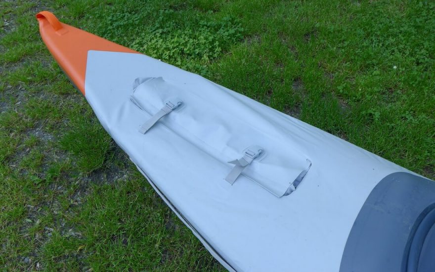 Konstrukčně se jedná o několik částí z materiálu PVC drop-stitch. Konkrétně jsou to dno a borty kajaku a potom tři menší části v okolí kokpitu, které vyztužují palubu a rozpírají kajak do správného tvaru. Dvě z těchto výztuží mají ventil vně lodi (na palubě), ale třetí (za zadákem) má ventil uvnitř, nezapomeňte tedy na něj, jako napoprvé já (to jsou ty návody). Palubu lodi pak tvoří jednovrstvé PVC, které se mezi nafouknuté drop-stitch části napne. V přední části je paluba opatřená kříženou kulatou pruženkou pro uložení drobnějších věcí a pruženka je také mezi kokpity, aby si mohl něco k ruce vzít i zadák. V zadní části je v palubě otvor s možností uzavření zarolováním a zajištěním pomocí plochých popruhů a plastových spon. Nošení kajaku je možné buď pomocí ok z plochých popruhů na špicích nebo pomocí madel z plochých popruhů na obou bocích lodi.
