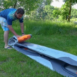 V batohu je vše potřebné k sestavení lodi, včetně návodu, několika záplat a klíče pro případnou servisní práci s ventily. Pumpa součástí balení není. Z pouzdra jsem vybalil samotný kajak (navážil jsem mu 26,7 kg), dvě sedačky z EVA pěny a tvrdého polyetylenu a dvoje plastové opěrky pro nohy. Velmi příjemné je, že kromě nasazení nožních opěrek a uložení sedaček není třeba nic sestavovat, šroubovat nebo jinak kompletovat. Za to dávám palec nahoru. Pokud člověk není úplný začátečník a s nějakou tou (nafukovací) lodí už se někdy setkal, pak bude mít kajak brzy nafoukaný a připravený k vyplutí i bez použití návodu (tato věta nemá nabádat k tomu nečíst návody, jen ilustruje, jak snadné a intuitivní může sestavení kajaku být).