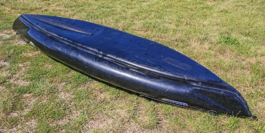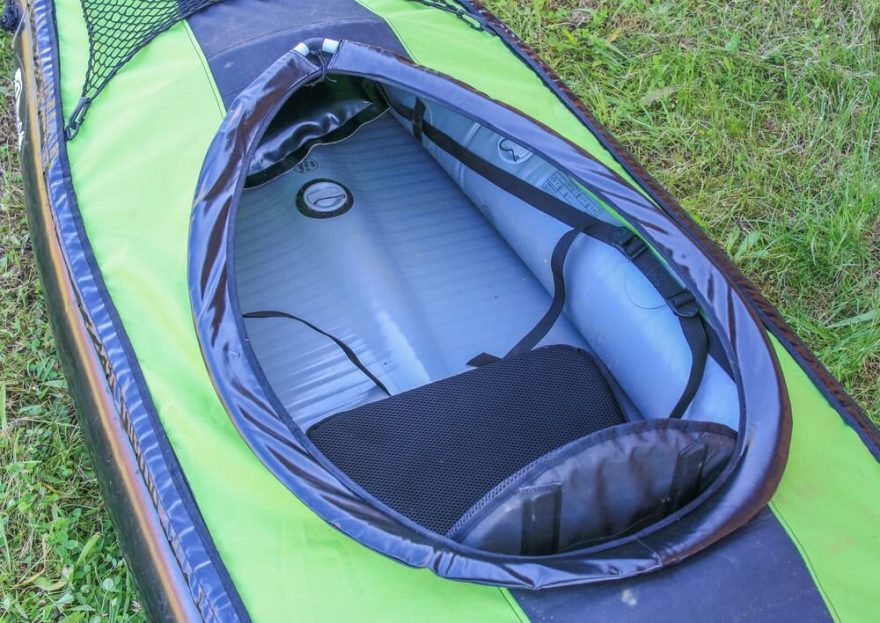 Přejít do galerieKompletně drop-stitchové je dno lodi. To znamená, že je zcela ploché a velmi tuhé. Jediné místo, kde je drop-stitch deska přerušena je okolo ventilu. Ventil se nachází v přední půlce kajaku, před sedačkou, kde je i kýl. Ten začíná skoro u špice lodi a končí těsně před sedačkou. Logicky je to samé vyboulení, jaké tvoří kýl, i uvnitř lodi, ale člověku nijak nepřekáží. Navíc je šikovné, že máte ventil po ruce.