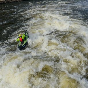 Jako obvykle jsme si neodpustili i trochu náročnější terén, než kam je kajak určený a sice kanál v Troji a několikanásobné splutí šlajsny jezu Nový Mlýn při vypuštěné Orlické přehradě. Obě místa jsou obtížnostně tak okolo WW IV, tedy už výrazně nad možnostmi lodi. V obou místech se podařilo s kajakem vcelku bezpečně proplout, dovnitř se nám nedostala vůbec žádná voda, což svědčí o kvalitě napojení paluby na borty i o povedeném řešení límce. Už ale bylo cítit, že loď na takové vodě není dostatečně ovladatelná a dost narážíme na její limity. Při rovné jízdě to ještě jakž takž jde, ale při manévrování je to hodně znát. Opět ale připomínám, že se jedná o jinou vodu, než kam je Rush určený.