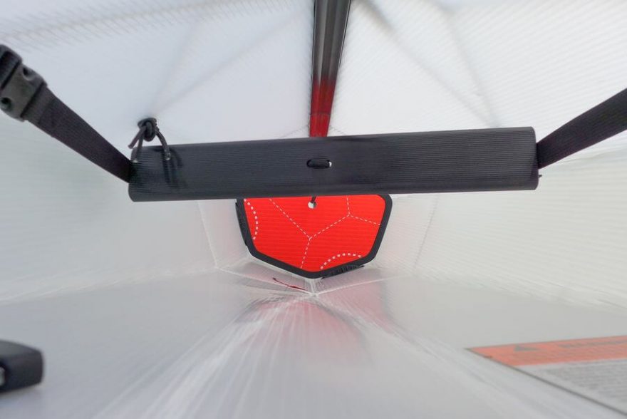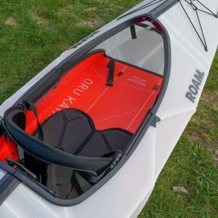 Sedačku tvoří pouhý pěnový podsedák, který se provlékne pruženkou a tím se upevní k oranžovému kokpitu. Z tohoto řešení jsem měl trochu obavu, ale nakonec se sezení ukázalo jako pohodlné a překvapilo mě. Boční opěrky tu chybí, zádová opěrka je stavitelná, dostatečně veliká a pohodlná. V oblasti stehen můžete namontovat opěrky, které jsou také stavitelné. Já jsem je někdy použil a někdy ne a obě varianty jsou za mě přijatelné. Do náročnějšího terénu bych bez nich ale nevyjížděl. Opěrka nohou je řešena jednoduchou tyčí, které je upevněna přes plastové spony a plochými popruhy k sedačce. Plastové spony zajišťují případný posun opěrky a ten je velmi hladký. Celé seštelování sezení zabere doslova pár vteřin. Jak jsem již zmínil kajak je uvnitř dělen třemi deskami, které tvoří jakési komory, nepočítejte ale s tím, že by byly vodotěsné. Funkcí desek je krom vytvoření/oddělení komor také vyztužení trupu lodi. Pokud do komor něco ukládáte nebo to z nich chcete vyndat, musíte rozešít palubu lodi, což je trochu zdlouhavé řešení, ale originálně řešený kajak holt musí mít nějaké kompromisy. Samozřejmostí jsou madla pro nošení, pruženka pro předměty denní potřeby před límcem, kulatá šňůra okolo paluby.