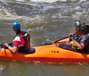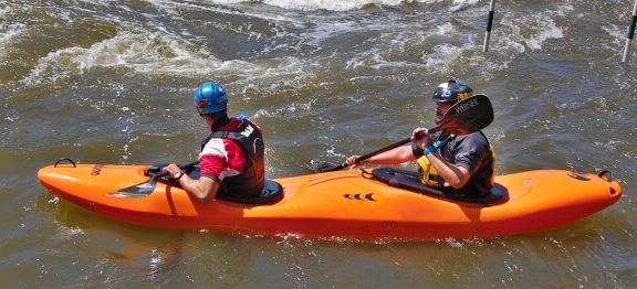 Na vodě jsme jezdili coby dva zkušení kajakáři a zpočátku jsme se trochu prali. Každý je zvyklý na to svoje a tak vás kolega občas překvapí nějakým nečekaným náklonem, záběrem o trochu dřív, než ho děláváte vy apod. Když se ale posádka sehraje, což nám netrvalo dlouho, zvládnete zajet, cokoliv si umanete. Výjezd kanálu v Troji od „Tlamy“ až nahoru? Není problém. Ve dvou naberete obrovskou rychlost, kterou doženete menší obratnost způsobenu délkou lodi. Jízda rychle dolů po proudu je taky bezproblémová, hlavní doménou je opět rychlost a špice se díky rockeru dobře vynořuje. Boofvání je díky délce problém a tak, když to někam napálíte (Véčko, Tlama), musí přední pádler počítat s tím, že dostane průplach. Zkoušeli jsme vymetat i různé vracáky a brankové kombinace a i ty jsme celkem v klidu zvládli, akorát zadák musí lodi poměrně hodně pomáhat s dotáčením, jinak jste v ostrých manévrech zbytečně pomalí. Párkrát to i vypadalo, že zůstaneme někde viset, ale to se nikdy nestalo. Díky délce lodi je vždy jeden nebo druhý už za překážkou nebo ještě před ní a tak může situaci řešit. Loď je stabilní a nebude problém, když si zkušený vodák naloží dopředu někoho méně zkušeného a sveze ho. Jen bude k řízení lodi potřebovat trochu víc síly a bude muset dbát na pořádné náklony, které s ovládáním 2B hodně pomůžu.