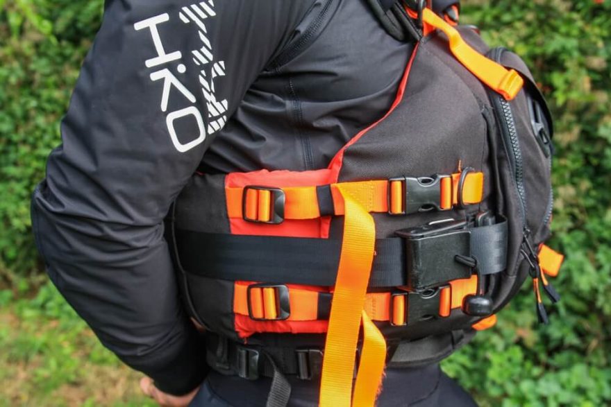 Anatomičtěji tvarovaný je i zádový díl, který přirozeně kopíruje tvar těla. Absolutní pohodlí v nastavení přesně na tělo pak doplňuje již osvědčený systém teleskopických pěnových boků vesty, které se zasouvají pod přední díl, trojice bočních plochých popruhů, které se dají na pravé straně rozepnout plastovými přezkami, aby se do vesto dalo lézt bokem a vše navrch stahuje klasický harness popruh, který je snadno vyměnitelný. Podtrženo sečteno si nedovedeme představit vodáka, který na sebe nedokáže vestu pohodlně napasovat.