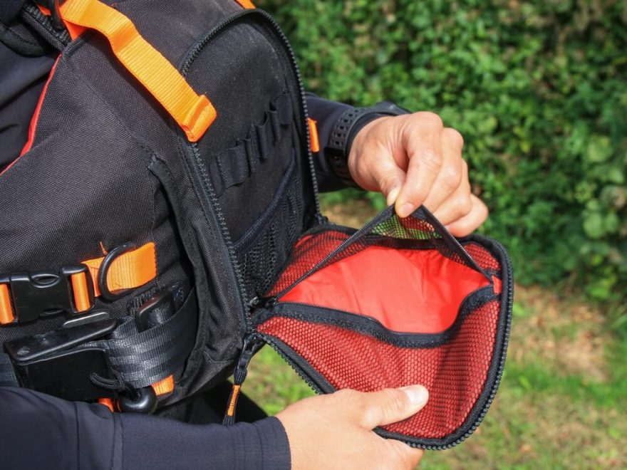 Oproti modelu 2019 byla značně vylepšena kapsa na předním dílu vesty, která už konečně nemá ani jeden neoprenový prvek, což bylo časté místo poškození. Hlavní dvířka kapsy jsou tuhá a je možné je doširoka odepnout pomocí plastového zipu YKK. Po vyklopení dvířek vznikne improvizovaný „stoleček“ a přehled v kapse je díky tomu naprosto perfektní. Dobře se dostanete k věcem umístěným přímo v kapse, v síťkované menší kapse, v gumových očkách nebo k věcem uloženým v síťkové mezikapsičce umístěné na vnitřní straně dvířek. Další menší kapsa je na vnější straně dvířek a vede do ní také plastový zip YKK. Uvnitř této kapsy je plastová karabinka na kulaté spirálovité pružence. Na vnější straně dvířek je ještě plastový čtvercový držák nože a chlopeň, pod kterou lze nůž hezky ukrýt. Možností, jak do kapes uložit materiál je tedy hodně a když se snažíte, tak toho naložíte opravdu dostatek. Zároveň díky mnoha organizačním prvkům nehrozí, že byste se ve věcech ztratili. Ze zkušenosti ale víme, že plně naložená přední kapsa už má poměrně velký objem, tak to s nákladem nepřehánějte.