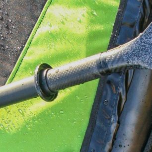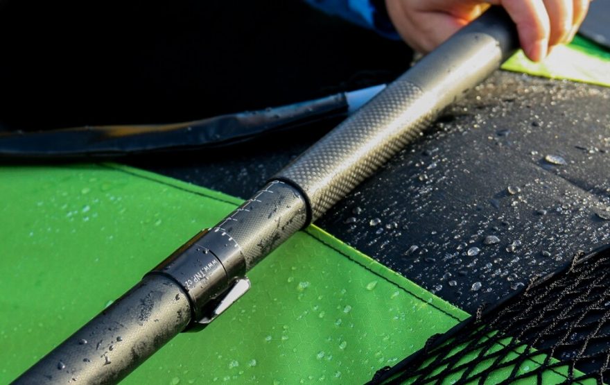 Já jsem měl pádlo osazené na sklolaminátové přebroušené žerdi (matný povrch) o průměru 30 mm. Žerď má na obou koncích, kde do ní jsou vlepeny listy, karbonové konce. Spojení žerdi a listu je tedy kompletně karbonové (krk listu je rovněž karbonový, viz. výše). Spoj listu a pádla je dobře zakrytý a působí čistě. Zároveň jsem měl žerď se spojkou YP, která umožňuje nastavení délky pádla až +10 cm a také zvolení libovolného úhlu doprava i doleva. Samotná spojka je už léty prověřená a asi k ní není moc co psát. Za mě nejde mít na pádle lepší a univerzálnější spojku. U dříku spojky (v místě napojení dříku do žerdi) je žerď rovněž z karbonu. Žerď má ovalitu pro obě ruce a samozřejmostí jsou gumové odkapávací kroužky, kterými lze pohodlně pohybovat.
