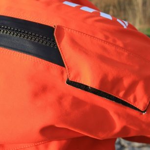V přední části kalhot nechybí kratší „ulevovací“ zip (rovněž TIZIP), který jde zde krytý légou po celé svojí délce. Nohavice obleku jsou poměrně široké a dlouhé (takový skejtový styl), což jsem částečně řešil právě pořádným dotažením kalhot v pase. I tak jsem se ovšem neubránil tomu, že jsem si po koncích nohavic šlapal a abych tomu předešel, raději jsem si je ještě ohrnoval. Nešlo ani tak o to, že by mi vadilo, že nohavice prošoupu, na funkci obleku by to stejně nemělo vliv, ale spíš o to, abych si někde konec nohavic nepřišlápl a třeba kvůli tomu neupadl / neuklouzl. Výrobci jsem tuhle připomínku hlásil a prý si lze při objednávání obleku stahovací pásek nohavic poručit. Pokud jste tedy „neskejťáci“ jako já, je to dobré doporučení.