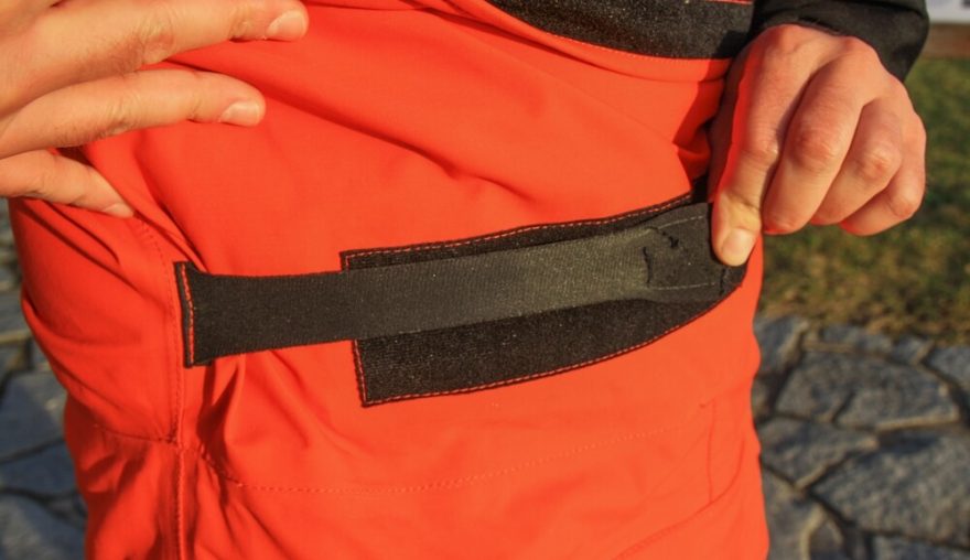 V pase najdeme vnější stahování, které je tvořeno zadním širokým neoprenovým panelem (stejný systém jako u již testované bundy RT-X) a vpředu je široký prostor pro uchycení dvou suchých zipů, jež umožňuje nejen jejich dotažení v obvodu pasu, ale taky nastavení dotažení výškově. Tento systém jsem chválil už u bundy a tady ho musím pochválit znovu. Pod vnějším stahováním je ještě druhé stahování, kterým si můžete v pase dotáhnout vnitřní kalhoty. O toto stahování se starají dva neoprenové pásky vedené od boků dopředu. Zpočátku jsem měl k tomuto způsobu utahování pasu nedůvěru – neopren přece za chvíli vytahám nebo roztrhám, říkal jsem si, ale moje obavy se nenaplnily a stahování zatím pořád funguje perfektně a já ho taky vždy využívám.