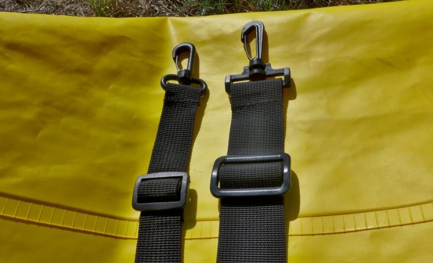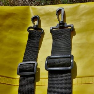 Větší loďák jsem během léta párkrát použil také jako nouzový batůžek na pěších výletech a musím konstatovat, že ploché popruhy jsou dostatečně široké, abych unesl i těžší náklad po delší dobu (výšlapy okolo 15 km s plně naloženým loďákem – náhradní věci, pití, svačina, lékárna). Menší vak má popruhy poměrově kratší a užší. Tady to na větší výšlapy nevidím, ale na poponesení někde podél vody není problém. U těžších nákladů jsem se trochu bál o výdrž plastových karabin, ale vše vydrželo bez potíží a mé původní obavy se tak nenaplnily.
