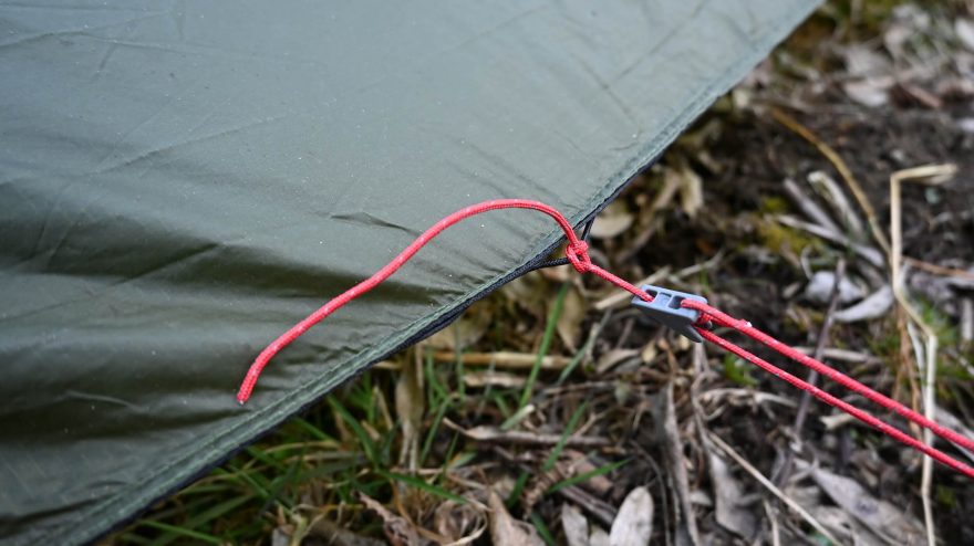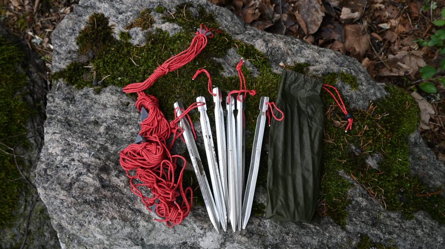 Součástí balení je tedy plachta, ale i sada 6 ks duralových kolíků a 6 ks reflexních šňůr. Kolíky jsou navíc opatřeny textilním okem (tenkou, avšak pevnou reflexní šňůrkou) tak, aby za něj šly snadno vytáhnout ze země. Reflexní napínací šňůry se hodí, abyste za ně v noci nezakopávali. Tenhle detail oceníte vždy, když je na fleku nebo v kempu více stanů. Šnůry jsou tenké, ale dostatečně pevné a délkově stavitelné. Vzhledem k malému průměru doporučuji se naučit zadrhávací či rekuperační uzly tak, aby se vám šňůry nezatáhly. Na webu jsou jednoduché návody, jak vypnout Shelter Tarp včetně ukázek zmíněných uzlů a uzlíků.