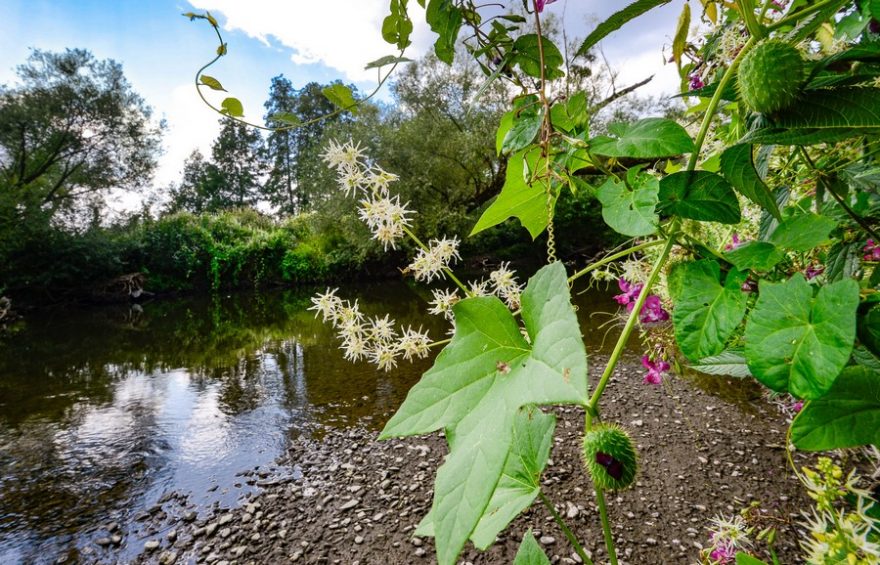 Za silničním mostem u Mohelnice vytahuji kajak na břeh a jdu se podívat k pískovně Moravičanské jezero. Čistá voda a písečné pláže lákají ke koupání, krátce se smočím a pak pokračuji dál. Vjíždím do CHKO Litovelské Pomoraví a zároveň do dalšího nádherného úseku plavby. Ke břehu se přimyká smíšený les a řeka nádherně voní. Voní nejenom typickým bahýnkem a oblázkovými plážemi, ve vzduchu cítím i něco jiného. Prozkoumávám tedy břehy zarostlé obřími netýkavkami a objevuji liánovitou rostlinu s bílými aromatickými květy. Původně americký druh štětinatec laločnatý neboli indiánská okurka, patří mezi invazivní rostliny, spolu s kopřivami a netýkavkou žláznatou vytvářejí podél řeky úctyhodné aromatické bariéry.