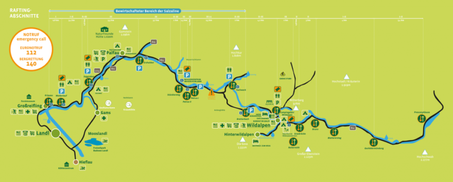 V orientaci na řece i okolo ní vám pomůže podrobný plán Salzy, který je kolem řeky k dispozici na nejrůznějších místech a před vyplutím byste si vždy měli ověřit také stav vody, dostupný on-line například zde: https://www.ennskraft.at/Pegelwerte/Wildalpen.