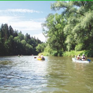 Orava je poměrně široká, naprosto nezáludná a také, ač se to ze břehu nezdá, docela tekoucí řeka. Ranní mlha se rozplynula a nás čeká nádherný den. Po zhruba 8 km se zastavujeme při ústí Studeného potoka na svačinku z vlastních malých zásob. Někteří odvážlivci, lépe řečeno odvážlivkyně, se v rouše Evině osvěžují v potoce, který dělá čest svému jménu. Je tedy naprosto jasné, proč se pánům do toho dobrodružství nechce!