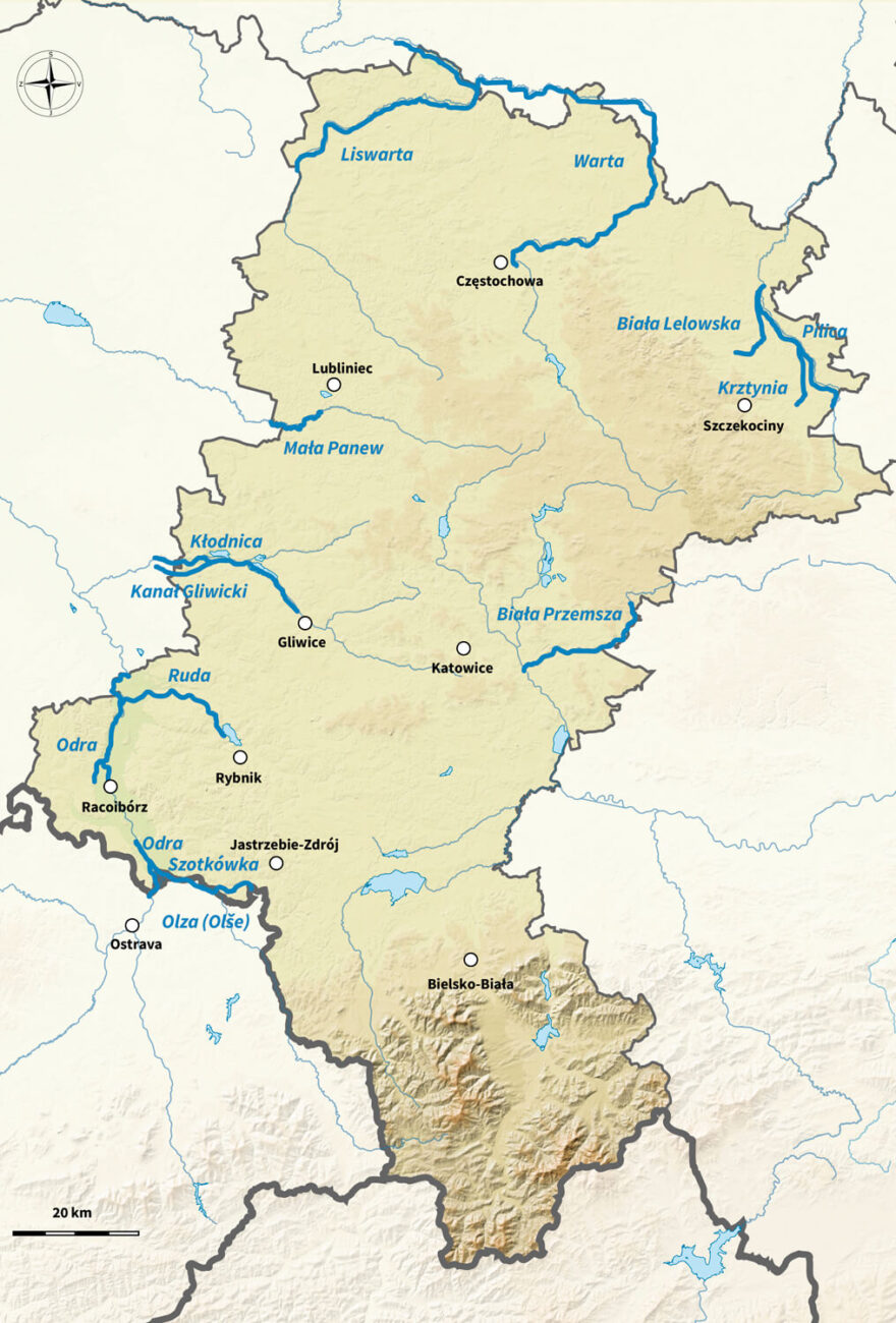 Ve střední části Slezského vojvodství najdeme řeky Białą Przemszą, Ruda, Mała Panew a Kłodnica, s níž úzce souvisí uměle vybudovaný Gliwicky průplav.