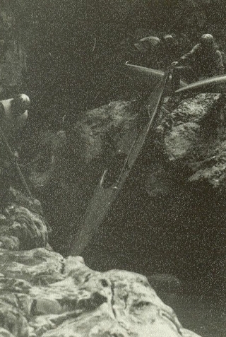 Ve vesnici Sanferno, kde jsme tenkrát spali, končila silnice a odtud jsme museli jít k místu nasedání 2 kilometry pěšky. Nejdříve šla cesta lesem, pak jsme klesali necestou po svahu dolů k soutěsce. Pomocí házeček jsme sestup zvládli, ale hned za první zatáčkou bylo zablokované místo. Místo jednoduchého přenášení to bylo lezení po obrovských balvanech k úzké suché soutěsce, za tohoto stavu vody nesjízdné. Lodě jsme nakonec naházeli asi ze 2 metrů do tůně a naskákali za nima do vody. Naše mnohdy staré laminátky by skok i s námi těžko zvládly.