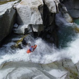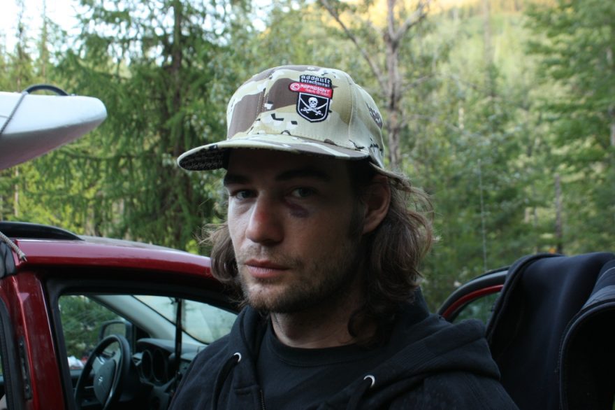 Další den si pamatuju úplně přesně. Nejdřív jsme jeli na nějakej creek, co měl hrozně divný jméno, takže jsem ho hned zapomněl. Prováděl nás tam jeden místňák, já zaplaval v takovým ošklivým místě a trochu jsem si pošramotil rameno. Večer jsme zase spali na tom parkovišti a Pilka zase, že musíme dát ten vodopád. Nakonec jsem se nechal ukecat, řek jsem si, že na těch pár záběrů to rameno zas tolik nepotřebuju a střihali jsme, kdo pojede první. První jel Pilka, na hraně neudělal nic a skoro přepadnul, a taky ohnul pádlo, který nechal před tělem. (směje se) Já jsem si řek, že na tý hraně musím trochu zabrat, letěl jsem pod úhlem tak 45°, dole jsem se praštil o palubu kajaku a vykrysil ten den podruhý.