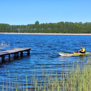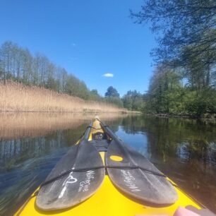 Přiznám, že vodní stav mohl být trochu vyšší – na několika místech jsem musel natahovat krk a kormidlovat mezi mělčinami a balvany, ale i to patří k zážitku a člověka to alespoň na chvíli vytrhne z ptačího rozjímaní. Občas mi cestu přehradilo i několik padlých stromů, ale byly šikovně prořezané, a tak nebylo nutné loď nikde přenášet. Bylo vidět, že na blížící se začátek vodácké sezony je vše připraveno. Viditelně se činily i půjčovny a kempy, kterých je u řeky opravdu dost, takže Czarna Hańcza je mezi Poláky zajisté vyhledávanou řekou. Lodě už byly vytažené na břeh nebo z kůlen a vesty visely na bidlech.