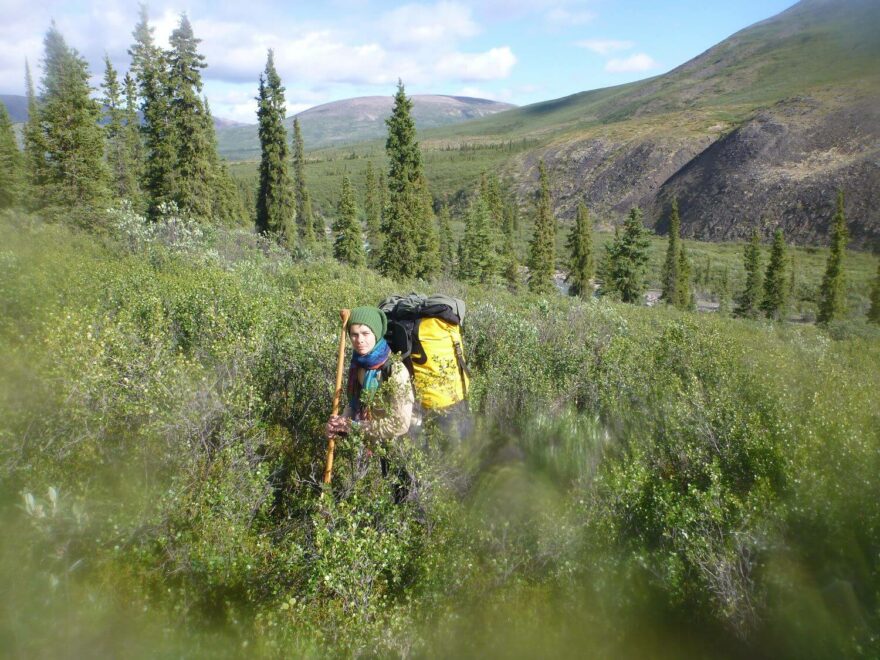 Bereme s sebou každý asi 20 kg věcí v batozích a jdeme „hledat cestu“. Pracně se proplétáme křovisky, neboť tundrové plató skončilo předevčírem. Podél řeky to nepůjde, musíme dostat asi 600 m nahoru do kopce a traverzovat nad údolím. Nemám z toho dobrý pocit. Jednak mezi stromy není možné vidět případného medvěda a jednak budeme muset spát uprostřed portáže v lese v jeho království se vším naším jídlem.