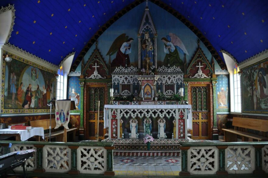 Nejúžasnější je tu ale kostel. Francouzský kněz ho tu před 150 lety stavěl 15 let ze dřeva bez jediného hřebíku. O skla si psal do Francie. Jeden dopis tam – jeden rok. Po 10 letech korespondence přišlo 120 oken, z toho sto rozbitých. Dalších 5 let trvalo, než byla budova osazená okny úplně. Nejkrásnější jsou syté barvy stěn i oltáře, všechny jsou vyrobené z místních lesních plodů a rozpuštěné v rybím tuku.