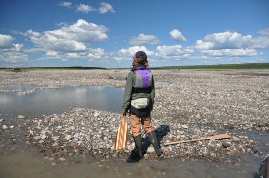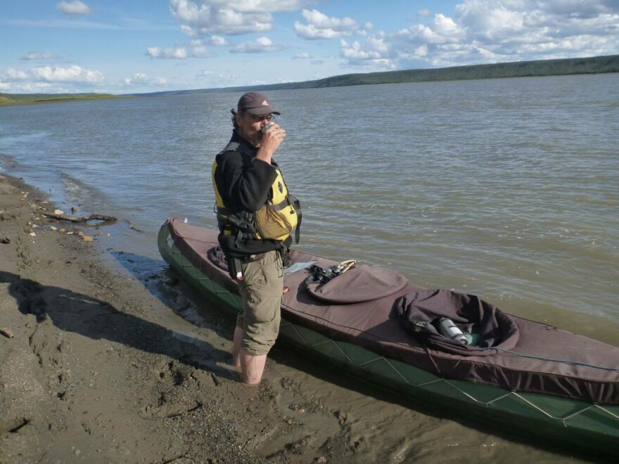 Závěrečná etapa, vstupujeme do delty Mackenzie. 80 km délky a 130 km šířky. Musíme se snažit plout ve východním rameni a orientace je opravdu náročná. Hledání místa na spaní je nadlidský výkon. Břehy jsou tak bahnité, že musíme sbírat větve, ty naskládat, a po nich opatrně dosáhnout břehu. Jinak je bahno tak řídké, že v něm noha zmizí až po stehno. Čistá voda v přítocích je také o dobývání. V jednom případě jsem o 20 m k malému pramínku bojoval hodinu. Ale to jsou právě krásné nevšední okamžiky cesty, na které budeme vždy vzpomínat. Potkáváme ještě loď geologů, kteří měří tloušťku permafrostu. Prý je tlustý od 80 do 800 m, ale na dně řeky Mackenzie má pouhých pár metrů. To chápu, dno s nezamrzlou vodou pod říčním ledem je v zimě nejteplejší místo v tomto absurdním světě.