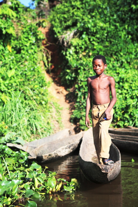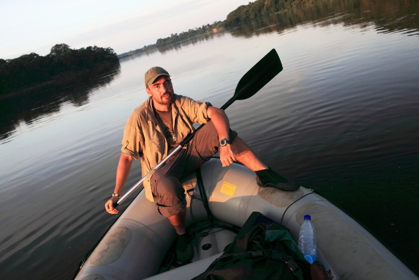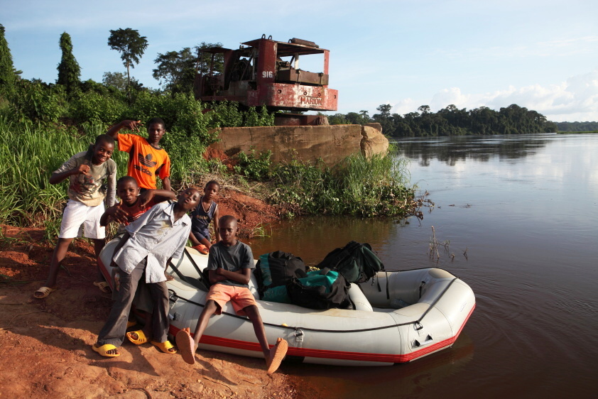 První setkání s řekou byl neskutečný pocit volnosti. Soumrak nás zahnal na první kempování k opuštěné chatrči uprostřed blátivé plantáže s maniokem. Plout po ohromné řece, která vypadá jako líná voda, může někomu připadat jako hračka, ale na mnoha úsecích dosahoval proud toku po vydatných deštích dobrých 11,5 kilometru rychlosti. Velká stabilní loď, kde je dostatek místa na zavazadla se ukázala jako prozíravý výběr. Jednak raft Pulsar byl jako tank a dokázal projet i spletí rákosu, hyacintů, nebo křovisky u mnoha ostrovů. A také poskytoval bezpečí proti případným hrochům a krokodýlům. Od vyplutí nás doprovázel panenský prales, který, i když vypadal stále stejně, byl neuvěřitelně fascinující podívanou. Na stromech si hrály tlupy opic, nad hlavami nám skřehotali vzácní ptáci Tirako a občas – obzvláště za soumraku – se z divočiny ozývalo troubení pralesních slonů. Zpočátku stálo kolem řeky spousty chatrčí rybářů a zemědělců. To se postupně proměnilo v absolutní divočinu a bylo až překvapující, jak na tak velké řece bylo minimum druhu „Homo Sapiens.“