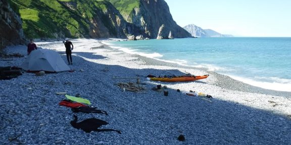 Po skoro půldenní plavbě jsme k večeru dorazili do zátoky, která se jmenovala „Russkaya“, a začali jsme vykládat materiál. Domovem na další dvě noci se nám stala malá plážička u dvou vraků starých ruských lodí, které obývali místní sezonní rybáři. Měli tam takový „skvot“… Z jistého pohledu to ale bylo místo velmi poetické. Po večeři jsme chvilku poseděli a šli na kutě. Na zítřejší den bylo naplánované cca pětatřiceti kilometrové pádlování dále na jih.
