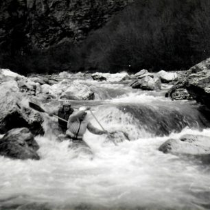 A pak druhý takový zážitek. Byli jsme v Bourg st. Moritz ve Francii, dodnes se to považuje za jednu z nejtěžších přírodních tratí. Přijedete v noci na louku u řeky a slyšíte dunění. Tak jsme šli na most a pod námi vlny jak baráky. Říkali jsme: „No to bude dobrý. Je tma a jak je tma, tak to zvětšuje.“ Pěkně jsme se vyspinkali, ráno přišli na most a ty vlny byly fakt velký. Teprve potom jsme se dozvěděli, že jak v létě taje voda z ledovců, tak u nás se přehrady pouští a tam se naopak zavírají. Takže tam teklo třeba 70 kubíků vody a oni to zavírali asi na 25, a to už se dalo jet. Vždycky to bylo na pár hodin na trénink a pak zase museli pustit vodu, která se jim nahromadila. Trénovali jsme tam asi čtrnáct dní a už jsme si zvykli a samozřejmě nás to lákalo. Tak jsme potom jeli za těch 70 kubíků sjezdovou trať asi dvanáct kilometrů. To bylo veliký. Tenkrát jel první kamarád Honza Červenka, to byl takovej samorost, přírodňák a měl rád tyhle extrémy. Byly tam takové vlny, že opravdu člověk neměl vůbec čas sledovat, kde kdo je. Vždycky vyjedete na vršek a rozhlížíte se, musíte jet dál těmi jámami a někdo se najednou objeví vedle vás. Tak takhle velký to bylo, to byl taky hezkej zážitek. A v 87 už jsme byli hodně oprsklí a za té velké vody jsme jeli sami. Blbli jsme s Frantou na vlnách a najednou jsme byli v lopingu na špičce postavený. Řekli jsem si, že sice umíme eskymáka, ale člověk nikdy neví, a přijít o loď a pádla před závody, to bychom asi úplně nemuseli, tak už jsme se uklidnili.
