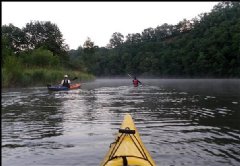 Start má proběhnout v pět hodin ráno. Balím si do kajaku spacák a knížku, abych měla co dělat až budu někde po trati marně čekat na svoz trosek. Stejná individua, která si přála abych o 5 km nedokončila objezd Rujány mě vyhazují z auta půl kiláku pod startem, zřejmě aby v cíli mohla tvrdit, že jsem to zase nedala. Dávám si to tedy pro jistotu dvakrát a jedu si vyfotit účastníky na startovní čáře. Správně tuším, že je tu v té ranní mlze co se válí po hladině matně vidím poprvé a naposledy. Zřejmá je pokročilá technika pádlování a vysoká rychlost. Než otočím Metaxu, jsou už skoro všichni v trapu, ačkoliv se ještě pořád vzájemně ujišťují, že nejde o závod.