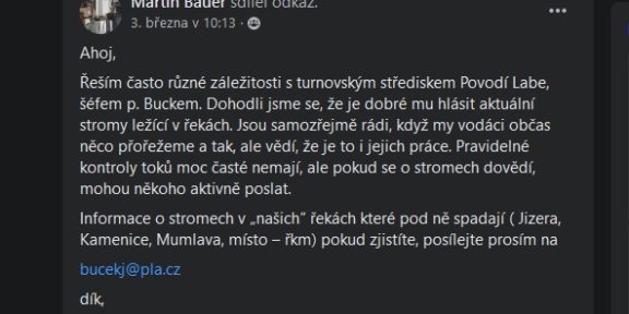 řeším často různé záležitosti s turnovským střediskem Povodí Labe, šéfem p. Buckem. Dohodli jsme se, že je dobré mu hlásit aktuální stromy ležící v řekách. Jsou samozřejmě rádi, když my vodáci občas něco přořežeme sami, ale vědí, že je to i jejich práce. Pravidelné kontroly toků moc časté nemají, ale pokud se o stromech dovědí, mohou někoho aktivně poslat.