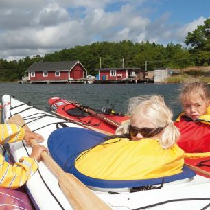 Do Švédska jsme jely dvě rodiny, tj. celkem čtyři dospělí a tři děti. Byla to naše první výprava s dětmi na mořských kajakách. Cílem bylo naložit kajaky a na týden vyrazit na moře, a proto jsme si to chtěli vyzkoušet v komorním kruhu. Každé dítě jelo se svým rodičem na deblu, já, coby lichý člen výpravy, jsem jela na singlu. Našim dětem bylo v té době 10, 8 a 5 let a v době odjezdu se téměř neznaly (před tím se viděly jenom jednou a vzhledem k tomu, že je mezi nimi poměrně velký věkový rozdíl, nevěděli jsme, jak spolu budou vycházet). Naše obavy se ukázaly jako naprosto bezpředmětné.