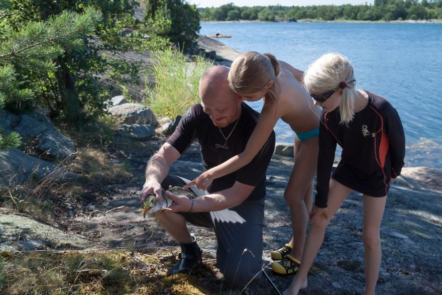 Velkou výhodou pádlování ve Švédsku na konci srpna je to, že ještě v deset hodin je vidět. V naší oblasti bylo potřeba dát si pozor na to, že na spoustě ostrovů je do 15. srpna vyhlášena ptačí rezervace a nesmí se tam stanovat. Na spaní jsme si vždycky našli vyvýšené místo s ohništěm a dostatkem dřeva, často i s roštem (který jsme s sebou vzhledem k předchozí zkušenosti nevezli). Kluci tvrdili, že podle roštu se pozná dobré místo na štiky. Díky dobrému počasí jsme při plavbě postavili stany jenom jednou, a to kvůli tomu, abychom tam dali věci, když jsme na celý den jeli pryč. Jinak jsme spali pořád pod „širánem“ (Janíkův výraz). Salinita vody není tak velká jako například v Chorvatsku, takže jsme používali mořskou vodu na vaření těstovin, brambor… Nikdo z nás s tím neměl žádný problém. Pitnou vodu nám stačilo doplnit pouze jednou. Pro děti byl neuvěřitelný zážitek vidět v přírodě orla skalního, rybáka nebo norka. Při plánování denních tras jsme trochu zohledňovali i umístění geocachí. Vždycky nás dovedly na moc zajímavé místo.