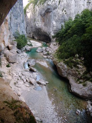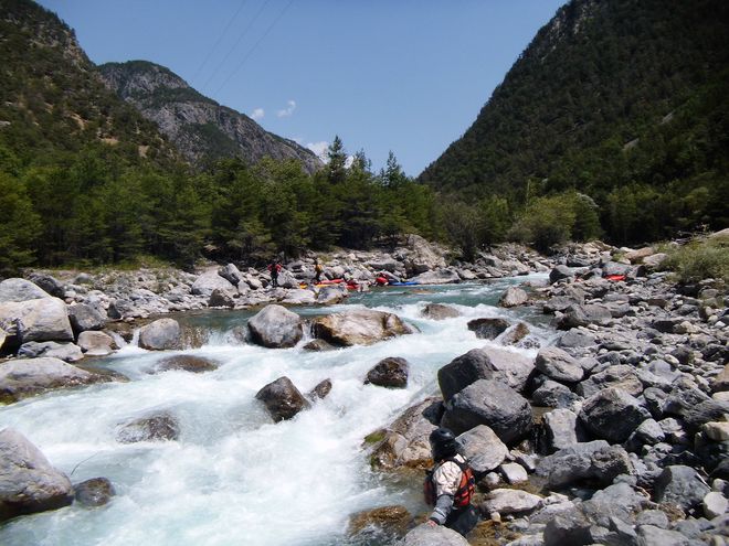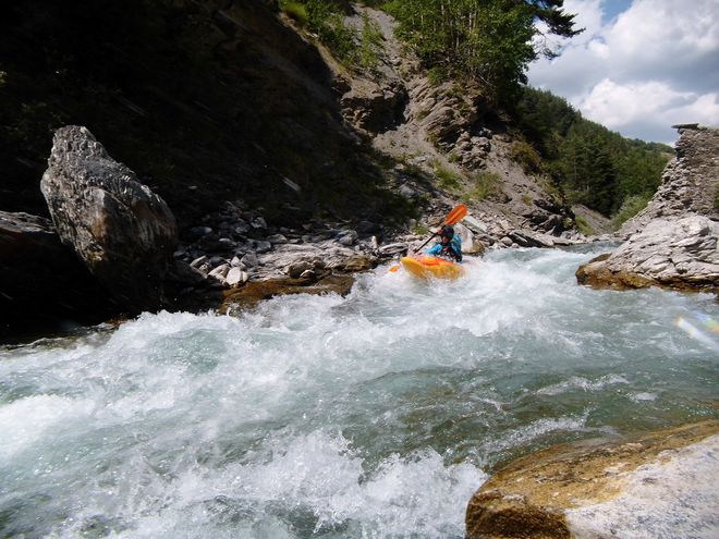 V jižní Francii jsme také nemohli vynechat řeku Ubaye, úsek od Martinet k raftovací základně nad Královskou soutěskou. Vzhledem k nižšímu stavu vody byl úsek pouze WW II – III, ale kluci s playboaty si užívali surfovacích vlnek a já parádní výhledy na okolní Alpy. Abychom si odpočinuli od každodenního pádlování, vyrazili jsme další den na pěšárnu do Verdonu. Trochu jsme doufali, že kdyby přehrada pouštěla vodu, mohli bychom kaňon jet na kajaku. Elektrárna pouští vodu většinou jednou týdně, rozpis naleznete na stránkách elektrárny. My jsme štěstí na vodu neměli, ale úsek je místy zablokován stromy a dle kilometráže se zde nachází i množství sifonů. Vyrazili jsme tedy pěšky a výhledy na kolmé stěny kaňonu byly dechberoucí. Ta hloubka!