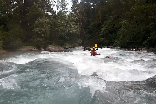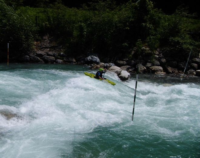 Následoval přejezd do Francie na řeku Clarée ve Val de Prés v blízkosti města Briançon, kde jsme se potkali českou skupinu, která den předtím prodřela na Clarée kajak. Při pohledu do koryta jsme se ale rozhodli pro sjezd jiné řeky v okolí, pro Guisane. Guisane má tři úseky, my jsme měli v plánu spodní dva. První dvanáctikilometrový úsek s nasedačkou u městečka Le Casset bych hodnotila jako WW II s esíčkem vyšší obtížnosti, za naší nižší vody max. WW III. Řeka je relativně široká a nabízí krásné pohledy na okolní Alpy. Kdo se necítil na lesní část pod městečkem Chantemerle, vystoupil si tu.