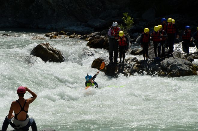 Vystoupit se nedá. Chvilku koukám, kde co lítá, nedávám pozor, trošku se nechávám vyšťouchnout z malého vracáku a už další peřej nedobrovolně najíždím. No paráda! Sype to z kopce a já prostě pádluju a honem hledám vracák, kde bych mohla vedení skupiny předat. Přeci jen po roce a půl ježdění ještě nejsem moc zdatný najížděč. Uf, vyděšeně dýchám a držím se kamene. Tři kilometry jsou nekonečné. Už jsme skoro dole, na vysedačku v Briançonu zbývá asi 500 m a docházejí síly. Sice odpočíváme ve vracáku, ale válečky pěkně tahají za ruce, peřeje jsou rozbité, chce to vyhýbat se kamenům.