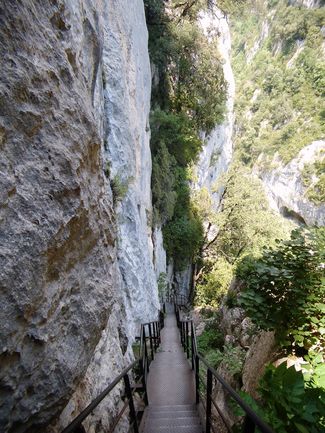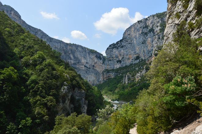 Cestou se prochází po schodech vysokých jak několikapatrový dům, pak dvěma tunely, které byly vyraženy začátkem 20. století se záměrem vést vodu ve Verdonu v trubkách pro energetické účely. Naštěstí byla stavba to několika letech zastavena, a tak si dnes návštěvníci mohou užít absolutní tmu v tunelu dlouhém přes 600 metrů. Baterku s sebou! V řece pod námi skáčou v polosuchém korytě nadšenci do kanyoningu, potkáváme horolezce. Po šestihodinové tůře se těšíme na to, až si konečně sedneme. Ale stálo to za to!