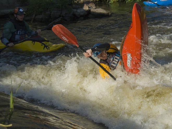 4. Následuje dotažení špičky k vertikále (ne do ní). Opřete se o pádlo a záběrem ho dotáhnete zpět až k lodi! (tím jste provedli wingover – „split wheel na zádi“). V tekoucí vodě se stačí jen opřít o pádlo.
