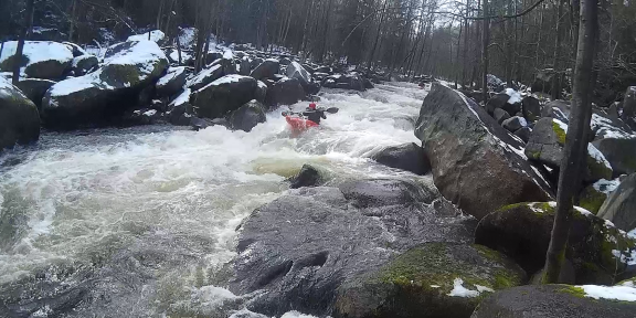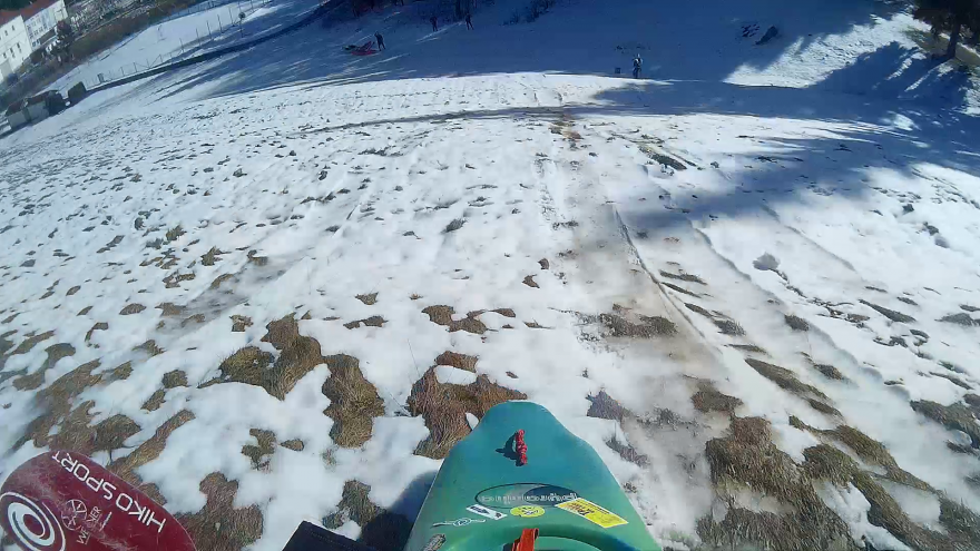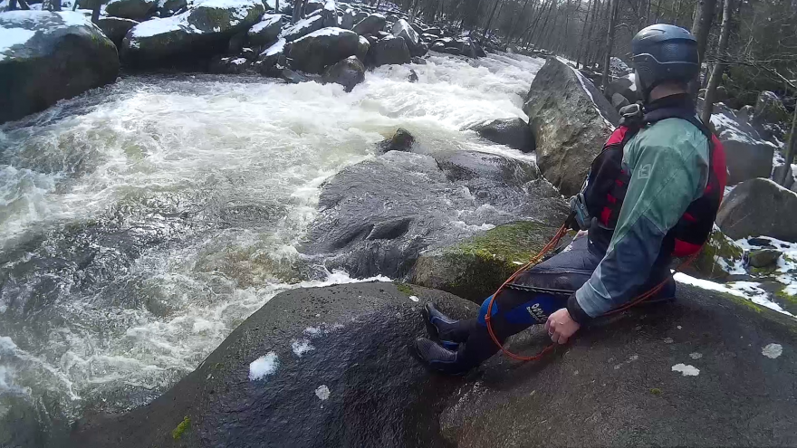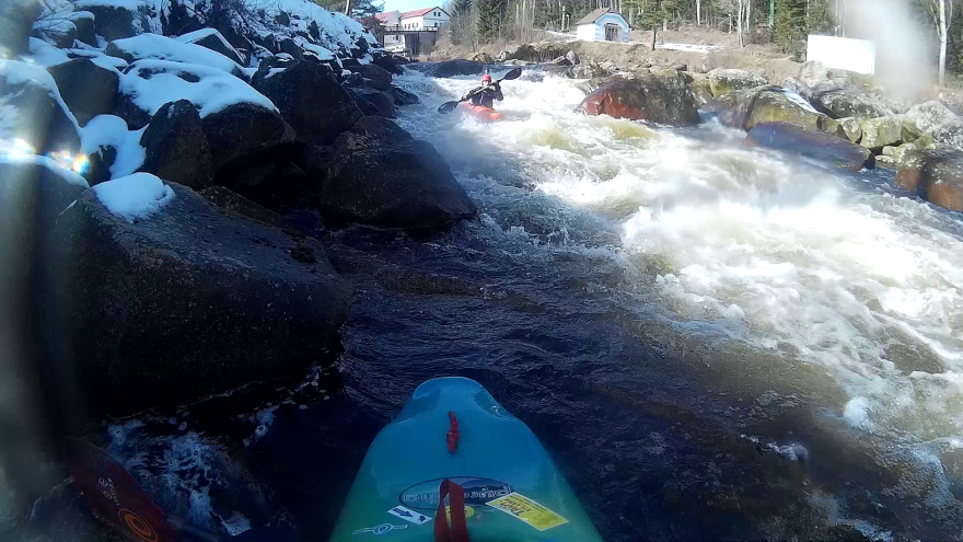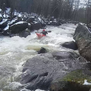 Pak už jsme jen vyrazili na hráz a po lehkém zaváhání, kdy Luboš dole málem trefil strom ( což slabší povahy vyřešily puštěním samotného kajaku a seběhnutím po svých) jsme využili zbytky sněhu a sklouzli hráz pěkně snowkayakmo. Pohled do koryta nás trošku zklamal, teklo o něco méně než na minulé návštěvě, ale stále sjízdné a pěkné. A když už jsme tu … Prohlédli jsme vršek, slalomku až po Váňův skok, vymysleli lajny pro všechny možné i nemožné případy a naskákali do lodí.