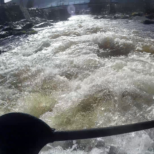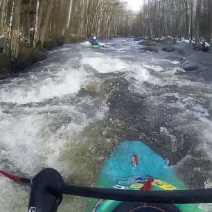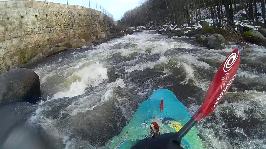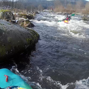 Prohlédli jsme si krásně odkrytou Kobylí hlavu i Železňák, prolétli závěrečnou peřej a už tu byly závěrečné vlny pod most k čističce, jedna z mých nejoblíbenějších částí. Vody dost, trošku z kopečka, paráda! Pak již následuje tradiční trénink pádlování přes rybník, cestou se s Petrem odhodláváme k eskymáku. Brr! Sklouzneme spojovací peřejka a pokračujeme k jezu v Loučovicích, vstříc spodní části pod Oknem. Tu pojedou tři z nás poprvé, dva z nás už ji jeli posledně.