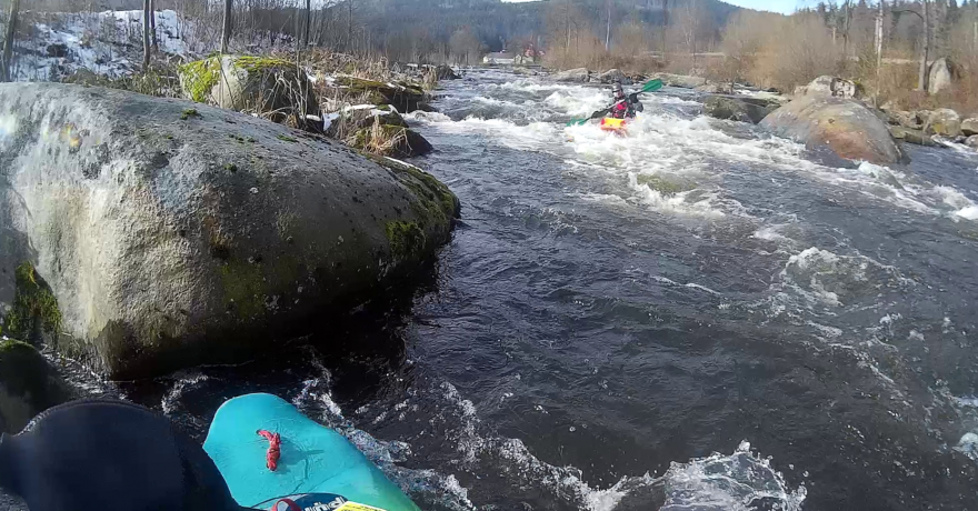 Tak tedy na druhý břeh a podél trati přenášíme pod jez. Krátká kamzičí vložka a pod jezem rychle koukneme na první peřej. Cesta se zdá jasná, středem a pak vlevo přes šutry. Měníme baterky v kameře a postupně vyrážíme. Když už ve vracáku čekáme jen na posledního, natáčím průjezd, pohoda, má to … Najednou se ale ozve se smích a z vody leze další krysa! Schovaný kámen ve vracáku přišel přesně do náklonu, následoval skoroúspěšný eskymák, ale končí krysou.
