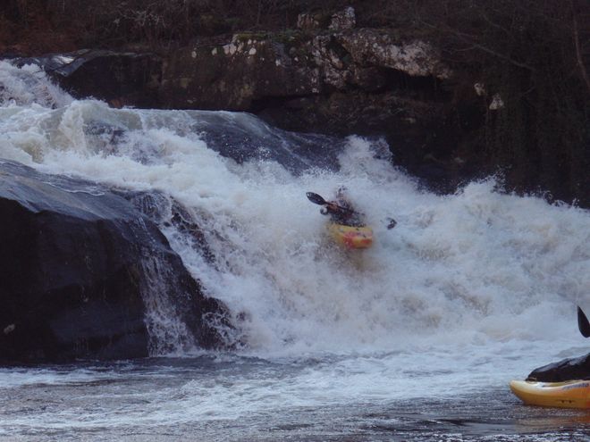 Brzy přichází úvodní skok, který vyžaduje totální pravý boof směrem doleva. Ne každý to zvládá a tak někteří končí na kameni vpravo pod skokem. Plukovník dokonce absolutně ohýbá špici svého milovaného Diesela a navíc do ní dělá díru. Jo holt to už chce natrénovat ten boof. Po pár záběrech dorážíme k nejvyššímu skoku úseku. Bohužel je skutečně málo vody. Nájezd je kamenitý a dopad by byl hodně natvrdo. Zatlačujeme slzu a tiše obnášíme. Však on tu na nás do příště počká. Řeka pokračuje hodně s kopce mezi velikými balvany a být o trochu víc vody byl by to skutečně nášup. Už už to vypadá, že se někdo naštve a začne nadávat, co jsme to jeli za blbost, když v tom přichází onen čarokrásný vodopád.