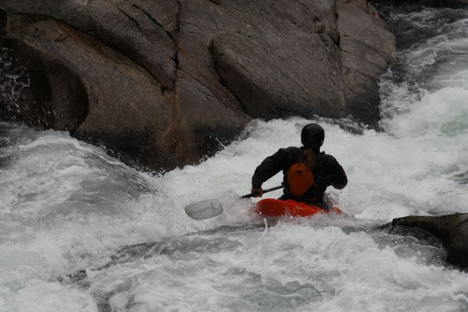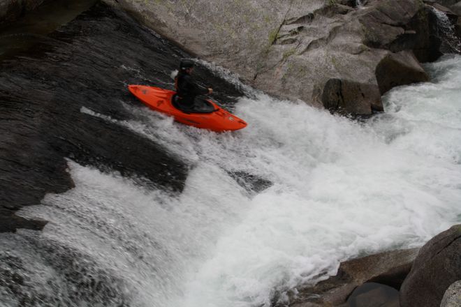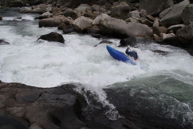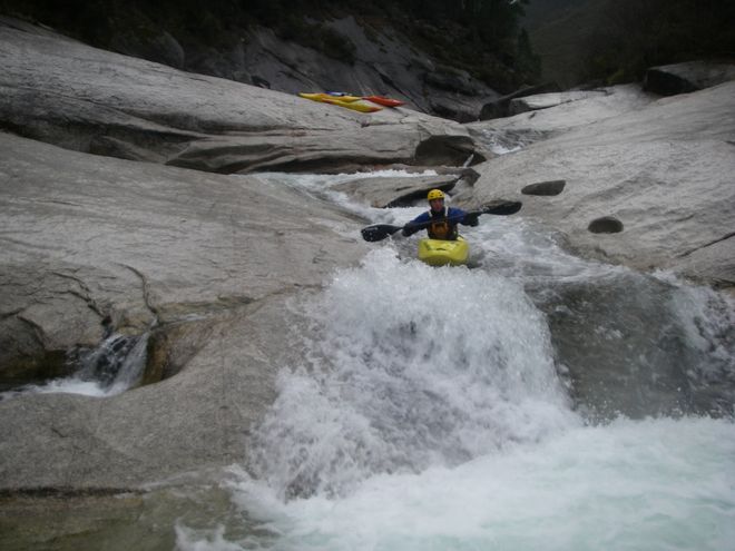 Ráno nás Leonel vyzvedává a společně s ním a jeho bratrancem jedeme na río Cavado. Prší a prý bude dobrá voda, aspoň to teda řikal nějakej jinej místní guru. Cavado na nasedání nevypadá, že by něco mělo ale věříme místním a nasedáme. Po dvou kilometrech brutální šutrovačky přijíždíme k místům, pro která se na tuto řeku jezdí. Řeka teče žulovým masivem a v krásných slidech a skocích padá do údolí. Sjízdné za každé vody a krásné. Leonel říká: „Californian style.“ Na vodě máme trochu strach o Leonelova bratrance, protože nám prozradil, že neumí zvedat. Celkově moc netuší co a jak by měl dělat, ale nakonec se mu daří všechno úspěšně přežít. Po California section nás čeká ještě další šutrování, ale už ne nijak dlouhé. Na vysedání z řeky se klasicky vrací voda z trubek. Tak i Portugalci přehraděj co se dá. Leonel vypráví, že na Cavadu by, nebýt přehrad, bylo asi 30 km podobných kalifornských úseků, jaký jsme jeli dneska. Stále prší a začíná se blýskat na lepší časy.