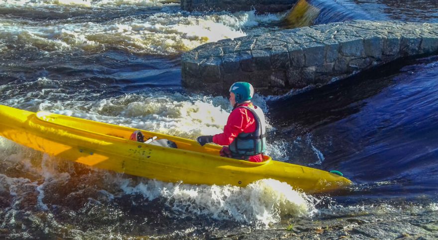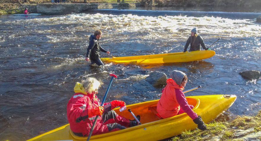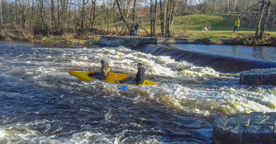 Otava je jedna z našich nejčistějších řek a její okolí je krásné, takže pohoda. 200 metrů pod startem je stupeň, který všichni sjeli bez problému. Po dvou kilometrech pak následuje jez Malá Chmelná. Tam se diváci na rozdíl od vodáků pobavili. Ve šlajsně byl váleček a pod ním to pěkně šplouchalo. Zastavili jsme na jezu, abych něco nafotila a vyplatilo se to. Prosincová koupel v Otavě potkala snad 6 lodí. Nezáviděla jsem jim a to jsem netušila, že se málem vykoupu také.