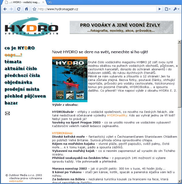 Tak se v polovině června 2003 narodila první internetová podoba HYDROmagazínu, která za těch pět a půl roku nedoznala mnoho změn. Redakční systém, který nám tehdy věnoval jeho autor Vít Červinka, už v té době nepatřil k těm nejmodernějším, ale i tak nám – a snad i Vám – celou tu dobu sloužil docela spolehlivě.