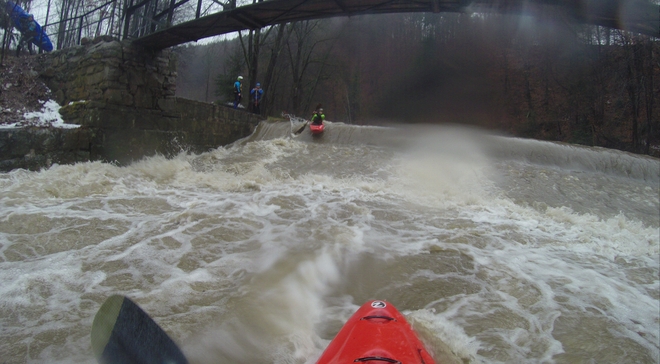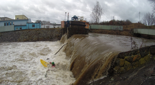 Lodě jsme sundali v Bohousové, teklo asi 30 kubíků a bylo 10 stupňů. Když se oficiálně pouští z Pastvin, teče 12 kubíků. Voda byla obarvená, a protože to ještě před chvílí byl sníh, byla i pěkně studená. První jezík na konci Bohousové připomínala už jen malá vlnka. Druhý jez na začátku Litic jsme šli nejdřív omrknout, byl čistý, sjeli jsme ho při pravé straně. Pak už nás vítal známý „Litičák“.