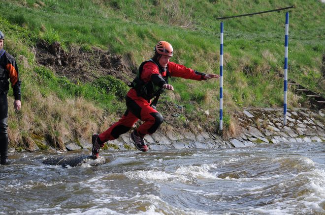 Je-li vše připraveno, i oba záchranáři, může akce začít. Zachraňující podle místa a situace ve správný čas buď vleze, nebo skočí do vody.